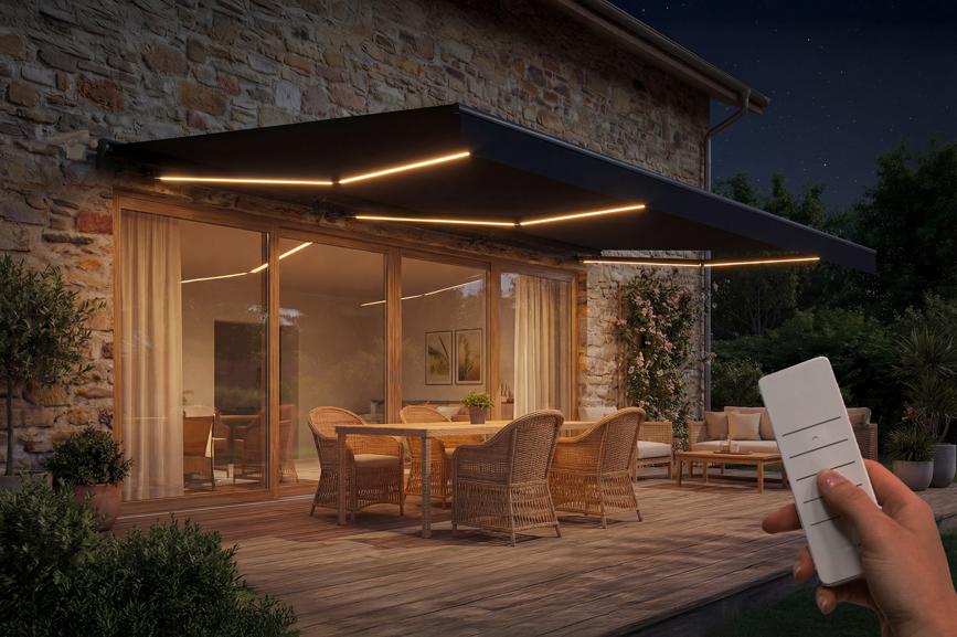 Enjoy optimal comfort with the FAZZIO motorized awning. Its electric operation allows you to extend or retract the awning with a simple touch, easily adjusting the shade on your patio to suit your needs. The awning is equipped with integrated LED lighting, perfect for enjoying your outdoor space even in the evening.