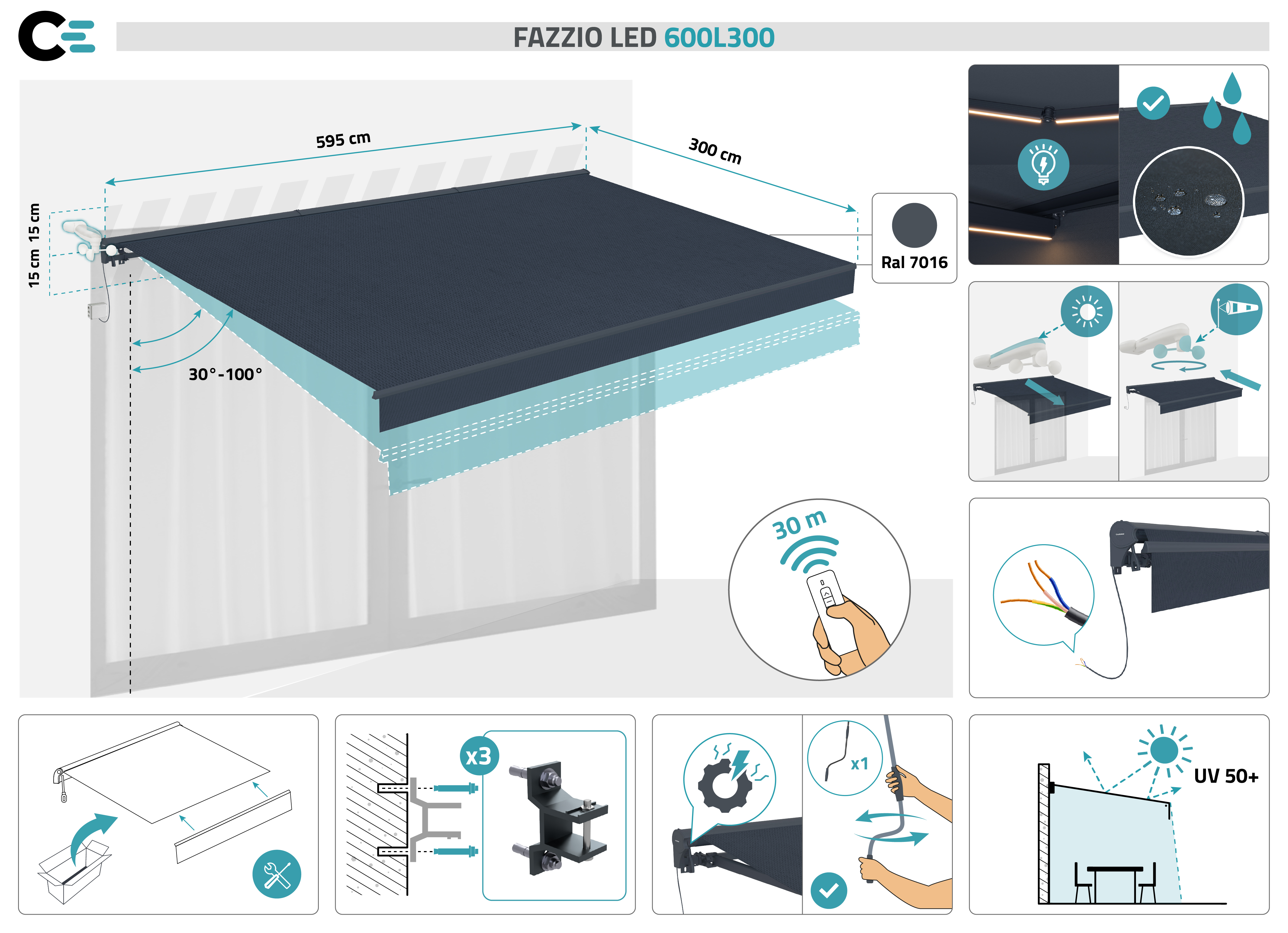 FAZZIO 6x3m semi-cassette motorized LED awning, grey, grey fabric